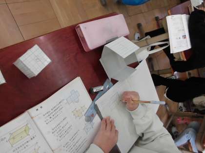 この単元では,直方体と立方体について学びを深めます。授業では,展開図をかいて実際に立体を組み立てたり,見取図をかいて立体のとらえ方を考えたりすることで,それらの特徴をつかんでいきます。