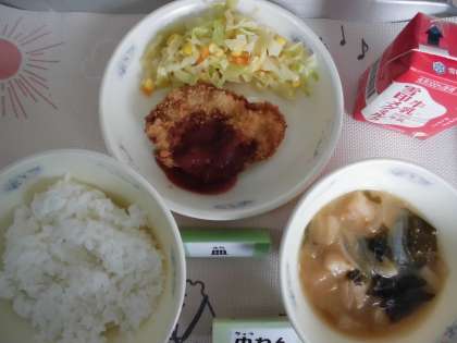 今日の給食は,『ごはん』『牛乳』『トンカツ』『野菜のソテー』『みそ汁』という地産地消メニュー(京北みそ)でした。