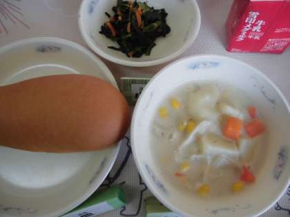今日の給食は『ミルクコッペパン』『牛乳』『コーンクリームシチュー』『ほうれん草のソテー』というメニューでした。