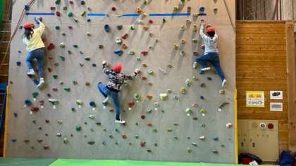 約3メートルの壁登りの挑戦が始まりました。自分の体をしっかりと支えながら壁によじ登っていきます。慣れてきたらホールドの色を決めて登っていきます。