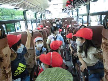 行きのバスからハイテンション。「おばあちゃんの家があった〜!」「幼稚園が見えた〜!」「ここ行ったことある!」と次から次へと外の景色に興奮していました。バス遠足ならではですね。そして,いよいよ動物園。キリンのお出迎えをうけて,大喜びのみんなでした。