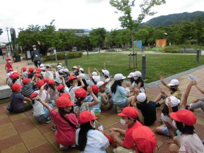 前日までの天気の心配は何だったのでしょう。今日は、暑いぐらいの遠足日和でした。みんなが毎日頑張っているからでしょうね!お日さまがにこにこ顔を出してくれました。