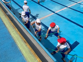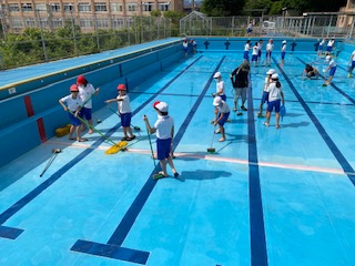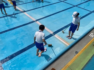 6年生は,6時間目にプール清掃を行いました。とても暑い日となりましたが,プールの中に入り,汚れた壁や床をモップと水で丁寧に磨いてくれました。昨日から掃除をしてくれた5年生や6年生のおかげで,みんなが楽しみにしているプールの学習ができますね。とても楽しみです。
