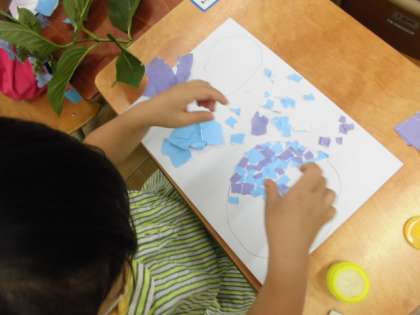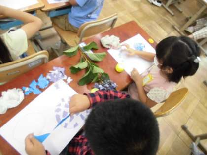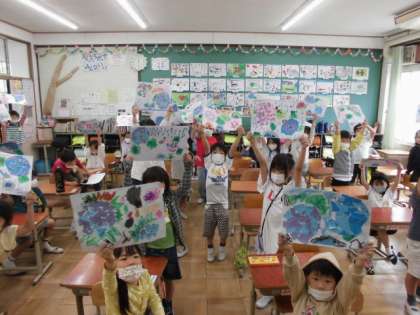 いろんなところで色とりどりのあじさいを見ますね。1年生も、あじさいを見ながら、ちぎり絵であじさいを描きました。折り紙をびりびりやぶり、あじさいの形になるように貼っていきました。教室が静かな空気に包まれました。最後にパスで周りの様子を描きたしました。素敵な絵が完成したみんな。絵を手にハイ!,チーズ!