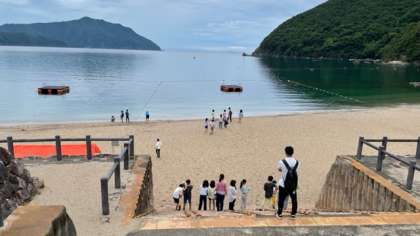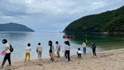朝の集いの後、浜辺に降りてみました。石投げや貝殻拾いを楽しんでいます。