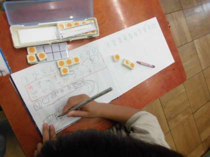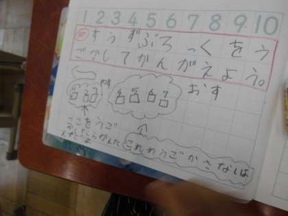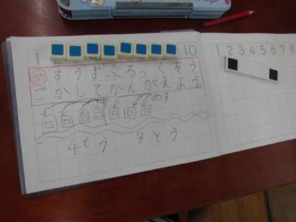 6月より、ノートに自分の考えを書く活動をがんばっています。今日はひきざんの学習で、問題を読んだあと数図ブロックを動かして考え、どんなふうにブロックを動かしたのかをノートにかきました。みんな自分なりの表現で、数字や矢印をつかってノートにかきまとめていました。