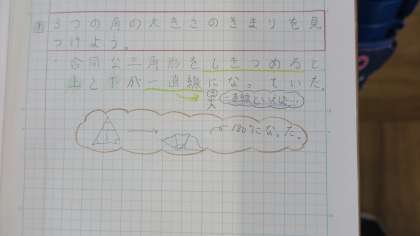 5年生は、算数「合同な図形」で三角形の内角の秘密を調べる学習をしています。三角形のカードを切ったり、並べがら、3つの角を合わせると180°になることを証明していました。
