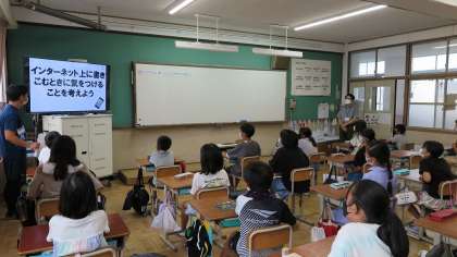 2時間目は,情報モラル市民インストラクターの方に来ていただき、「インターネットへの投稿の危険性」についての情報モラル学習を実施しました。不用意にLINEなどの SNSにコメントを書き込むことが大変恐ろしいことにつながることや、どんな点に気を付けなければいけないのかをグループで話し合いました。今後、SNSを使う際には、今日学んだことを思い出し、十分に気を付けてほしいと思います。