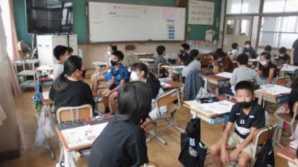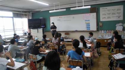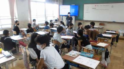 5年生は、外国語の学習をしていました。今日は、Small talkで“What 〇〇 do you like?”と尋ねられ、自分の好きな食べ物やスポーツなどを英語でこたえることを練習しました。みんな楽しそうに英会話をしていますね。