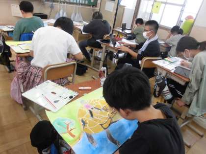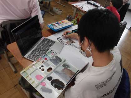 6年生は、図画工作「言葉から想像を広げて」の学習で、動物の絵を描いています。思い思いに好きな動物を選んで、自分のイメージに合うように表現を工夫して絵に表しました。