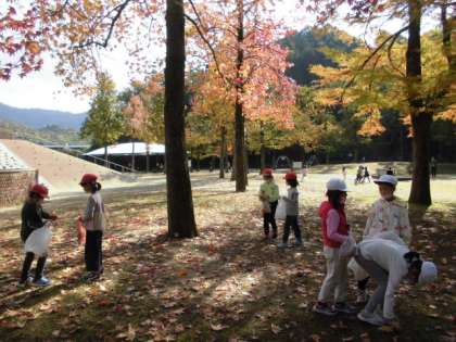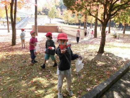 子どもの楽園に着いてまず「秋見つけ」をしました。きれいな色の葉っぱやどんぐりを見つけることができました。