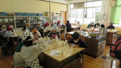 5年生は、家庭科の学習で昆布とかつお節を使った「出汁」の取り方を学習しました。ゲストティーチャーの方に来ていただき、昆布やかつお節のことを詳しく教えていただきました。その後、昆布だけの出汁と昆布とかつお節を合わせた出汁の違いを実際に試飲して確かめることができました。最後は、合せ出汁に塩、醤油をたした「吸地」を試飲することで出汁のうまみをさらに感じることができました。