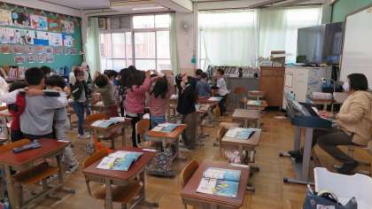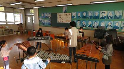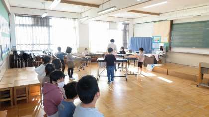 音楽の時間にグループに分かれて、音楽室で鉄琴、木琴の音を出す体験をしました。自分より大きな楽器の音を出すことができ、とてもうれしそうな様子でした。また、順番を待っている間、教室で大槻先生ときらきら星を歌ったり、動作を付けて踊ったり楽しく待つことができました。