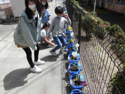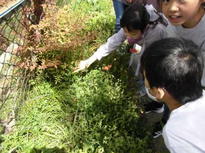 4年生では、1年間を通して、生き物の様子を観察していきます。今日は、春の始まりに当たる季節にみられる生き物を観察しました。チューリップを調べる人やナナホシテントウを観察する人がいました。カラスノエンドウの葉の上でナナホシテントウを見つけた人は幼虫もいることを見つけていました。
