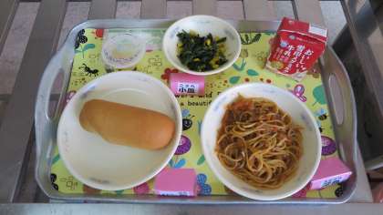 ・牛乳 ・小型コッペパン ・スパゲッティのミートソスに