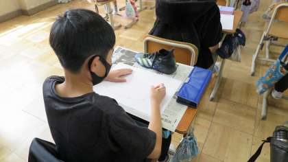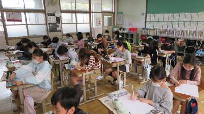 5年生は、図画工作の時間に自分たちのはいてる靴のデッサンを行っていました。見た形を丁寧に描く基本の練習しています。つま先からかかとの線を1本の線で描くように慎重に作業を進めていました。どんな作品が仕上がるか楽しみですね。