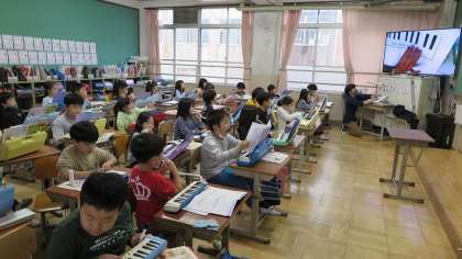 2年生は、音楽の学習で鍵盤ハーモニカの練習をしています。今日は、ソラシドの音をどの指で弾くのかを教えてもらいました。少しずつ「アチャパチャノチャ」の曲が弾けるようになってきました。これからもいろいろな曲が弾けるようになるといいですね。