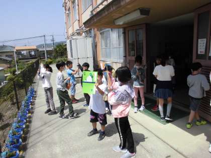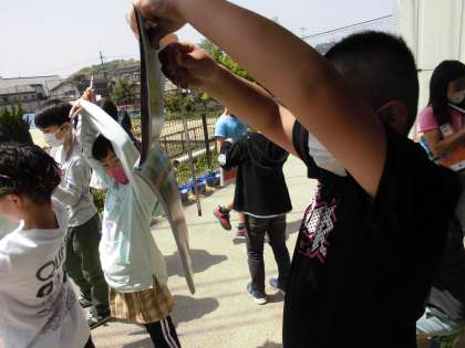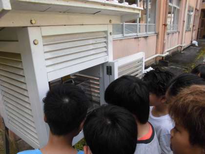 棒温度計で気温を計ってみました。日光が直接当たらないようにしながら目盛りを読んでいました。そのあと、気温を計るための施設として百葉箱を見学して、風通しが良い構造を確かめました。