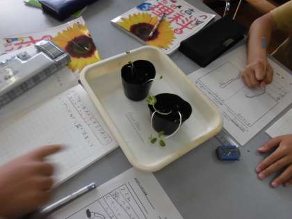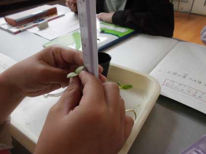 先週、種まきをしたホウセンカ、ヒマワリ、オクラ、ダイズが芽を出しました。種から芽が出ることを発芽だと学習し、ホウセンカとヒマワリの観察をしました。まだ種をかぶったままのものもありましたが、葉がひろがったものを見て形を調べたり、ものさしで長さを計ったりしていました。