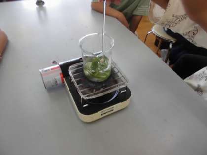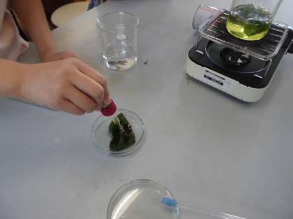 ジャガイモのでんぷんが、葉でできるのではないかと考えたので、日向のジャガイモの葉をとってきて、ヨウ素液で調べました。2,3分茹でた後、水で洗ってからヨウ素をつけました。しばらくすると、葉が黒っぽく染まってきて、でんぷんがたくさんあることが分かりました。次は、葉に日光が当たったことででんぷんができたのかどうかを調べることにしました。