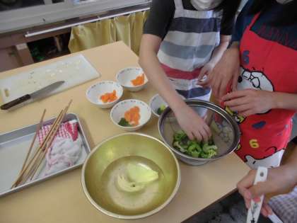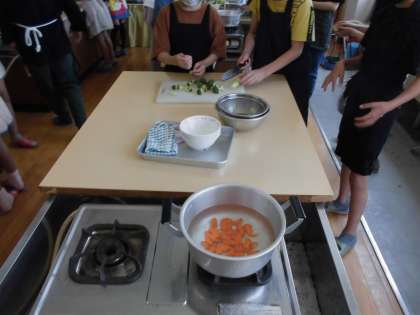 今日は、茹で野菜サラダを作りました。人参から茹で初めて、ブロッコリー、キャベツの順で茹でました。鮮やかになった緑色と濃いオレンジ色のコントラストもきれいに盛り付けることができ、おいしくいただくことができました。片付けの手際もよくなってきていて、週末の山の家での野外炊事が楽しみになります。
