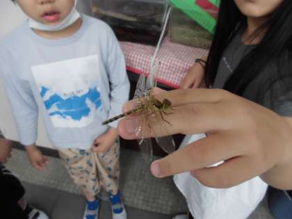 「アゲハチョウが孵った。」と、子どもたちが嬉しそうに教えに来てくれました。2匹目のアゲハチョウが羽化しました。また、「トンボも生まれた。」と、手に乗せながら見せてくれました。「トンボは何を食べるの?」と、聞いて、育ててあげようとしてくれました。先日、プールをさらえてとってきたヤゴを、水槽に入れて世話をしていました。