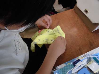 今日は、なみ縫いの練習まで行いました。針に糸を通して玉結びをして、玉止めをするところまで練習をしたあとで、練習用布になみ縫いを1回しました。初めなので、連続して縫い続けることはまだうまくいきませんが、慣れてきたのか、二針や三針ほど続けて縫う人も見られました。