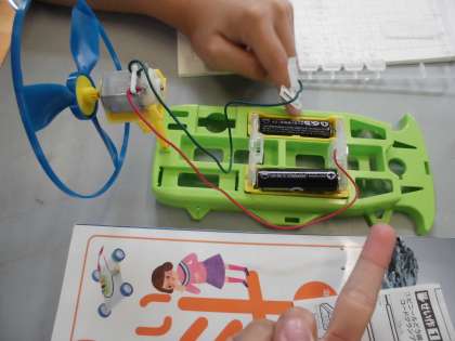 乾電池2個をへい列につなぐとモーターの回り方や電流の大きさがどうなるかを調べました。セットにあるへい列つなぎ用のプラグを利用して、モーターにつけたプロペラを回して確かめました。直列つなぎの時のように、速くは回らなくて、電流計で調べると、0.5Aだったので、乾電池1個の時と同じだから速くないんだとわかりました。