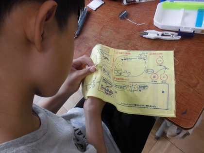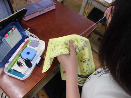 なみ縫いに続いて、返し縫いの練習をしました。本返し縫いの手順を確かめた後、それぞれの練習布で練習をしました。続いて、半返し縫いの縫い方を確かめて練習しました。初めてなので布の持ち方などがうまくできずに、ゆっくりですがひと針ごとに心を込めて練習していました。