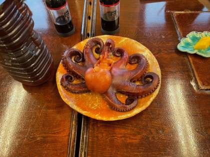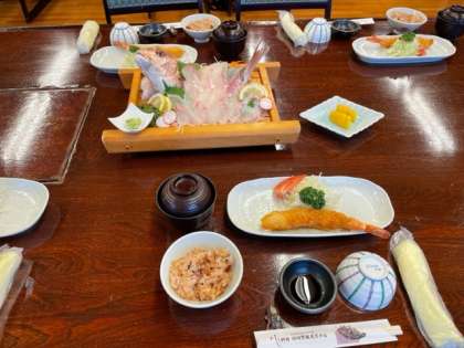 昼間しっかりと活動をしたのでみんなお腹がペコペコです。お食事は、海の幸がいっぱいです。