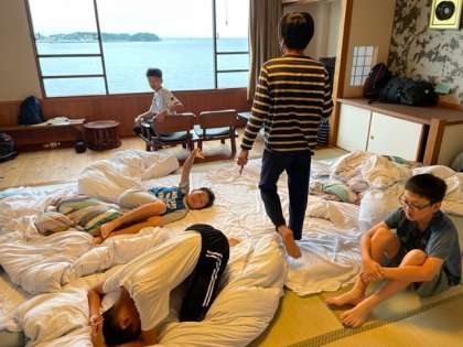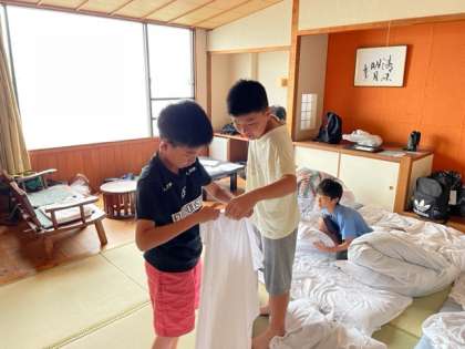 起床後の様子です。少し眠たそうにしている子もいますが、寝具の片付けが始まりました。昨年の経験を活かし、シーツを協力してたたんでいます。