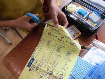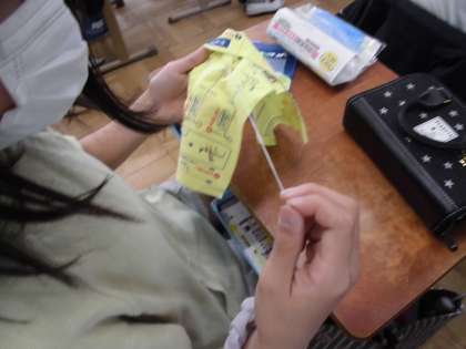 今日は、かがり縫いの仕方を知って、返し縫いが早く終わった人から取り組みました。布の端を裁ちばさみで切り落として、練習用布で練習しました。玉結びを作ることにも慣れてきて手際よくすることができていました。