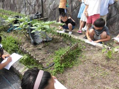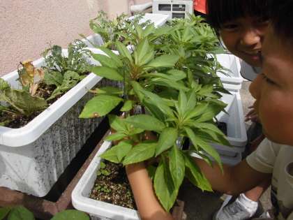 6月に入って、ホウセンカやヒマワリが育ってきました。ヒマワリの葉を触って「ザラザラしてる。」と言っていました。ホウセンカの葉の広がりを見て、花が咲いたようだと感じた人もいました。