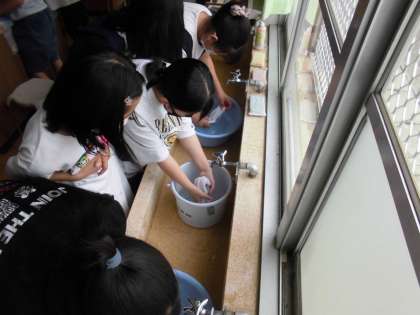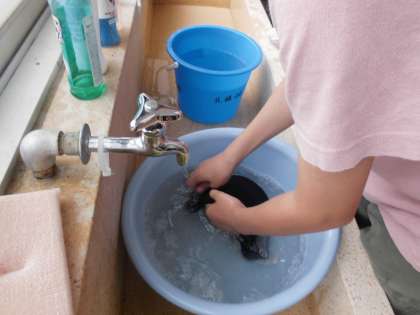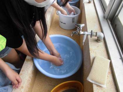 衣服の手入れを自分でするために、手洗いの練習をしました。洗剤液の中で洗っていると、思っているより液が汚れてきたので、洗濯したものがきれいになってきたと喜んでいました。2、3回、ため水ですすぎしぼった後、物干しに並べて干しました。