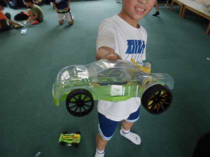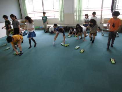 乾電池を2個つないで、モータの回り方が変わることを確かめてきました。学習に使ってきたキットを組み立てて、モーターカーを走らせました。へい列つなぎで走らせる人で競争しあったり、直列つなぎで走った車を追いかけたりと楽しんでいました。