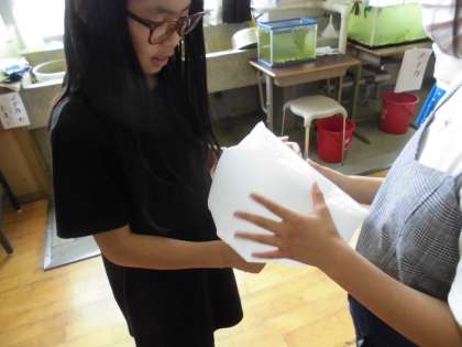 空気を袋で閉じ込めておしてみると、手ごたえがどうか調べました。思っていたより硬かったので驚いていました。