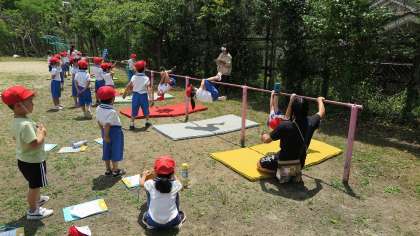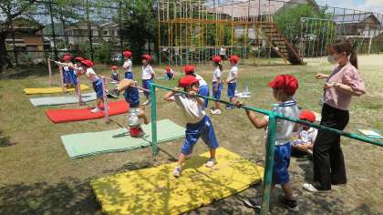 梅雨の中休みとなった久しぶりの青空の下、1年生は、元気に鉄棒遊びをしていました。カードを見ながら、自分のできる技に挑戦したり、まだできない技に挑戦したりしながら鉄棒を楽しみました。