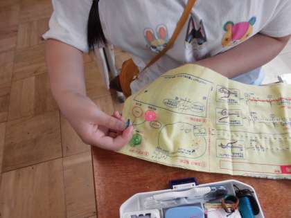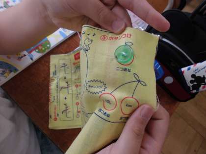 今日は、ボタン付けを練習しました。練習用の2つ穴のボタンと4つ穴のボタン、それと脚付きのボタンを練習布に縫い付けました。ボタン穴に針を通すのが難しそうでした。