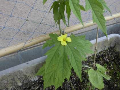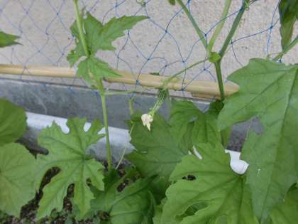 ツルレイシの花が咲きました。雄花だけでなく雌花までも咲いていて、実が育っていくのが楽しみです。