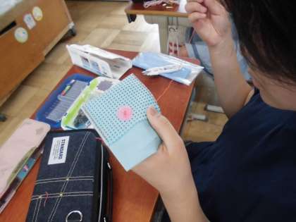 練習布のボタン付けまでを終えられたら、付属のフェルトで小物入れを作ります。これまでに習った縫い方を工夫して、ボタンで留めるかわいい小物ができてきています。
