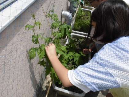 ツルレイシの雄花と雌花を観察しました。花のもとに実になるところを見つけけると「雌花や。」と教えてくれていました。
