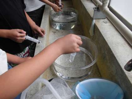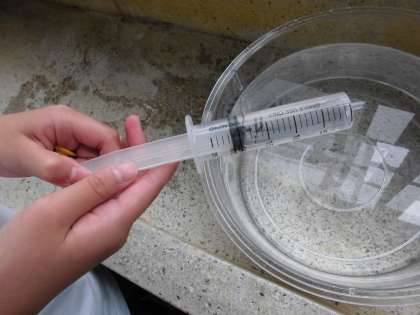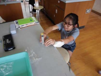 注射器に空気や水を入れて、おしたときの手ごたえを調べました。空気は小さくなりその分元に戻ろうとしてキャップが飛び上がりました。同じようにしても、水は体積が変わらないことに驚いていました。
