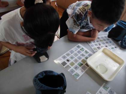 動物の食べるものをたどっていくと、最後は植物につながります。メダカが食べる小さな生き物(ミジンコ)も緑色の小さなプランクトンを食べていることを確かめた後、カイミジンコを観察しました。