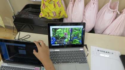 生活科の時間にGIGA端末で撮影したアサガオの様子を「見つけたよ」カードに描いていました。GIGA端末を使うと、自分の見たい写真を大きくすることこができるのでとても便利です。今日は、GIGA支援員の先生に教室に来ていただき、操作で困ったことがあればすぐに助けてもらうことができました。
