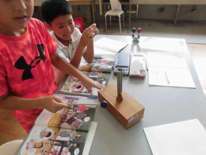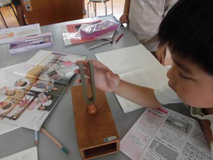 音が出ているものがどうなっているか、音叉を使って調べました。かすかな音も共鳴箱をつけるとはっきりと聞こえました。音が鳴っているときは震えているということに気づいたので、音叉を水につけてみて、水紋がひろがるかどうかを調べて震えていることを確かめました。