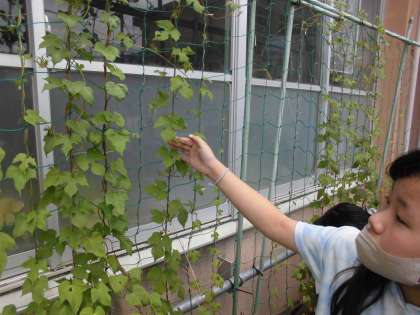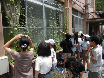 植物の実ができ方について調べていきます。今日は、アサガオを観察して実ができているところを見ました。すでに咲き終わっていて花が少なかったので、1年生が育てているアサガオの花と比べながら、花が咲いたところに実が育っていると考えました。