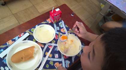 給食時間中、じゃがいものクリームシチューの中にハート型の人参が入っている子がいました。ラッキー!!楽しい時間になりました。