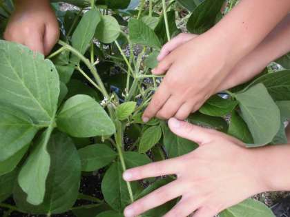 前回、観察できなかったダイズの花を、プール横の畑のダイズで観察しました。白くて小さい花に「小指の爪の半分もなかった。」と驚いていました。
