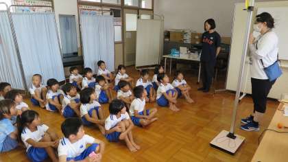 1年生は、身体計測を行いました。養護の先生からの計測中の約束をしっかり聞いていたので、とっても静かに順番を待つことができました。夏休み前からどれくらい身長や体重が伸びたのか楽しみですね。計測後は、歯磨きの指導をしてもらいました。毎日の歯磨きもしっかり頑張ってくださいね。