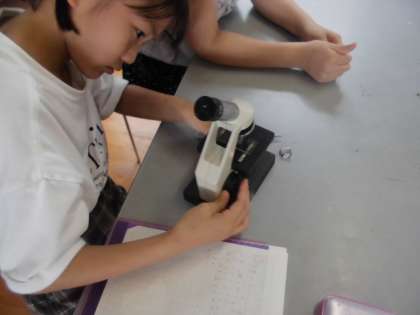アサガオの花の花粉を観察します。顕微鏡の使い方を覚えて、練習用のプレパラートで観察できたグループから、花をとってきて花粉を観察しました。時間が十分なかったので、また、次回にも観察します。